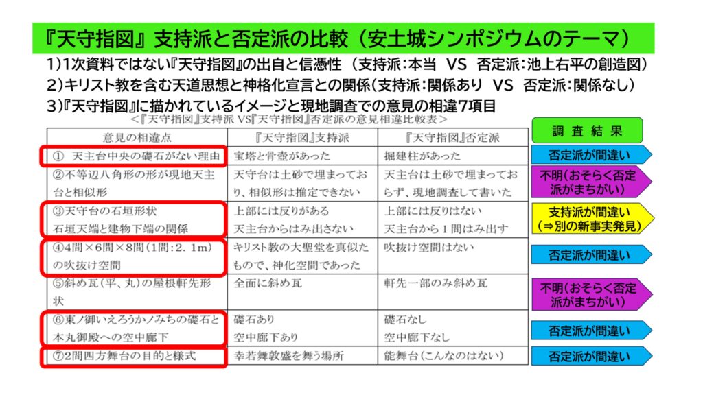 日本の百名城に選ばれ、歴史上も最も注目される城の一つで多くの人々の関心が高い安土城だけにこれは聞き捨てならない問題である。改めて、安土城の正しい姿は何か、各々の学説・論点を吟味・整理して、納得いく結論に導いてもらいたいと強く期待している。
